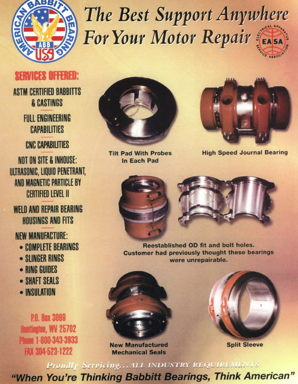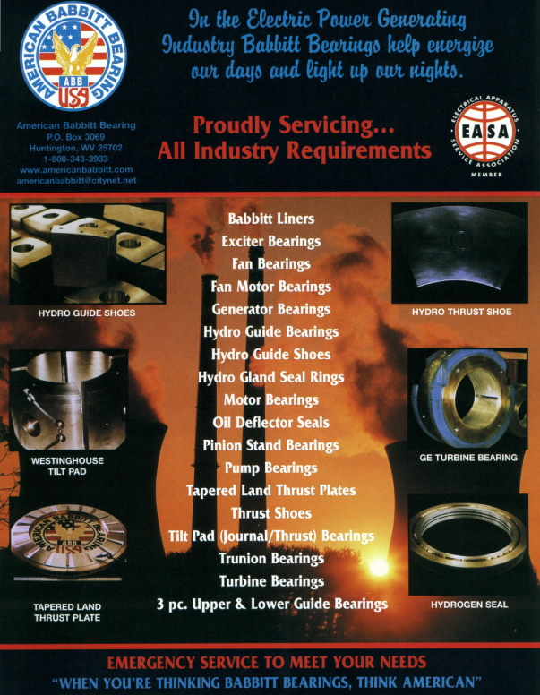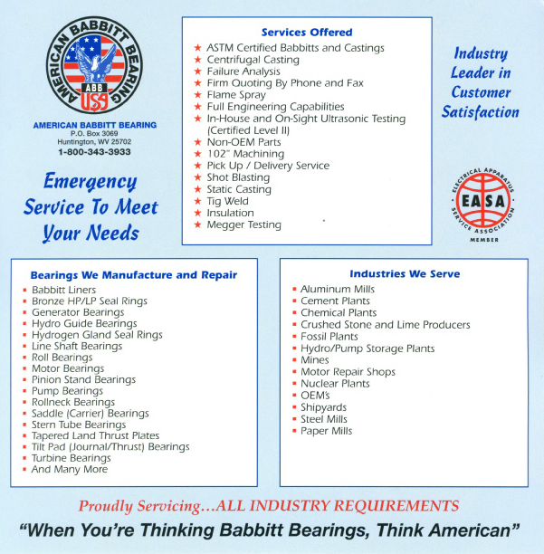 American Babbitt Bearing, located in Huntington, WV, has been providing quality bearing repairs for over 15 years. Our primary servicing areas include fossil, hydro, and nuclear power generating facilities, cement, steel, and paper producing facilities, and motor repair facilities. Geographically our customer base includes all of North and South America. Check our company brochures to learn more about American Babbitt products and services.
